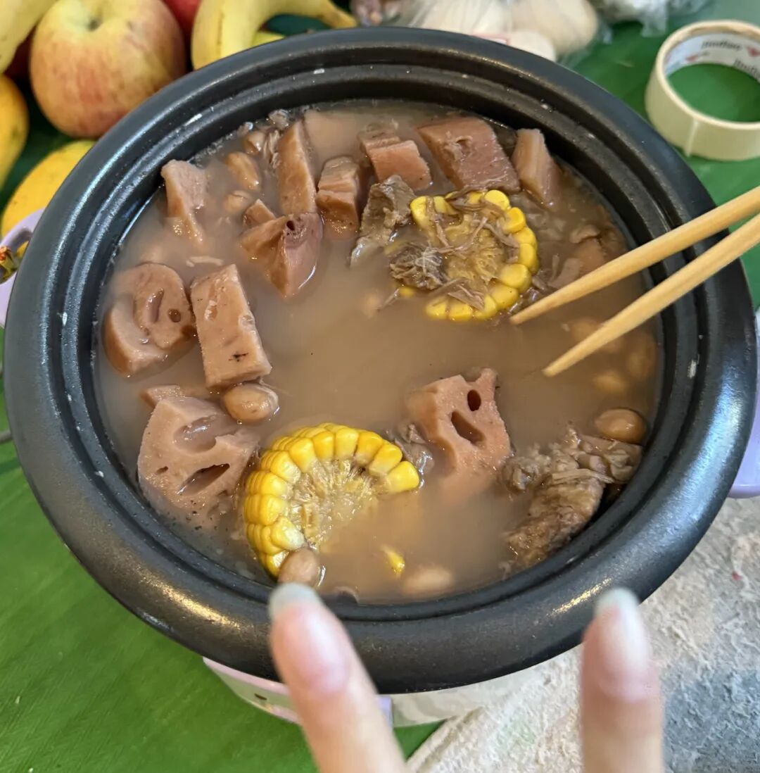 随着歌曲的吟唱,我的思绪飘回了春节前夕。今年,爸妈在南方度假,我和女儿熬到除夕放假,到广西陪他们过年。没想到,一下高铁到酒店,妈妈神奇般地变出了用电饭煲炖好的排骨藕汤,那软糯的莲藕与入口即化的排骨,在这异地他乡,让这碗汤更添了几分温馨与特别。