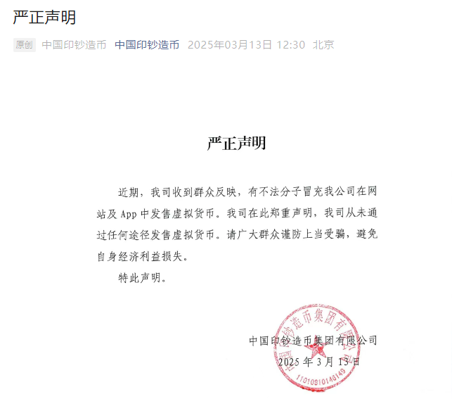 3月13日,中国印钞造币集团有限公司在“中国印钞造币”微信公众号上发布《严正声明》。