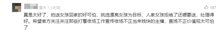 账号“**冉”频繁发布“深夜送女孩回家”为主题的视频,存在博眼球换流量问题。