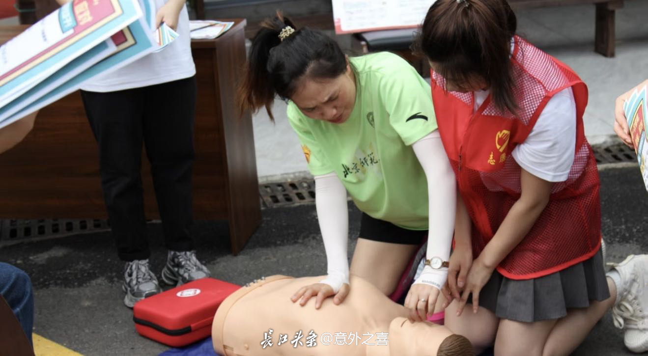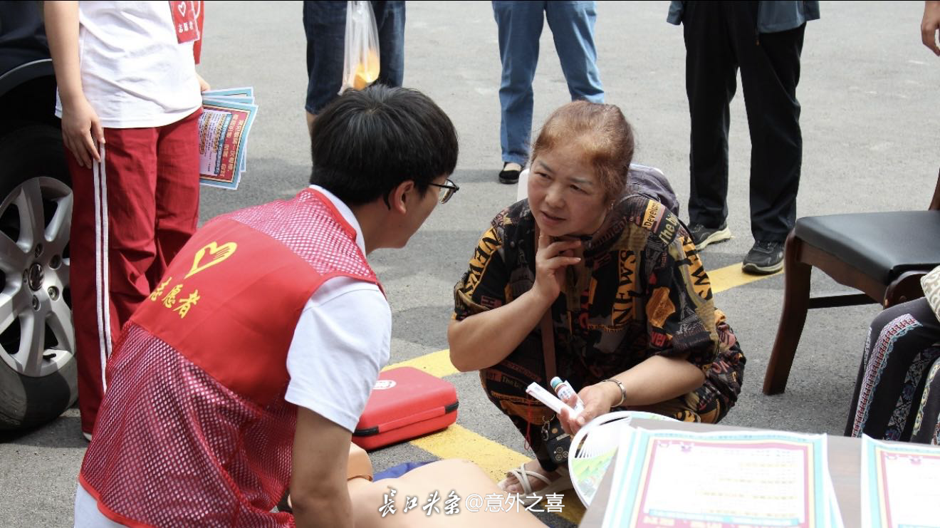 要领,一边示范标准动作。围观的居民们屏息凝神,有的掏出手机录像,有的跟着比划手势。当听到“黄金4分钟”是抢救心搏骤停患者的关键期时,张大爷感慨:“以前只在电视上看过,今天自己试了才知道多不容易!学会了这些,遇到紧急情况也能帮上忙。”在心肺复苏体验区,居民们轮流上手操作,实践团成员则在一旁“一对一”指导。“您的按压深度不够,再用力一点”“手臂要伸直,靠身体重量下压”……纠正声与鼓励声此起彼伏。带着孙子参加活动的刘女士笑着说:“孩子玩得特别投入,还说要当‘家庭急救员’,这种活动既有趣又能救命,真该多办!”