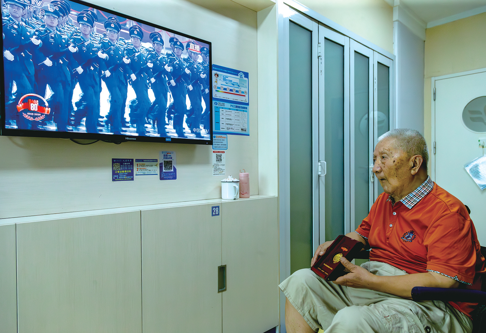 3日上午8时许,在市人民医院老年病中心10病室,96岁的抗战老兵刘守印穿戴整齐,早早守在电视机前,等待观看阅兵式。