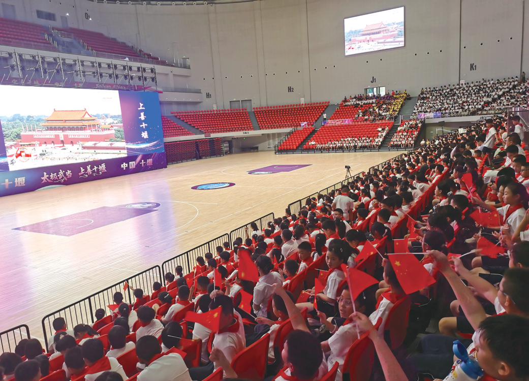 汉江实验学校2500余名师生齐聚十堰奥体中心综合体育馆,共同收看阅兵式。9时许,天安门广场礼炮鸣响的声音通过大屏传出,全场师生瞬间沸腾,手中的国旗汇成红色海洋。