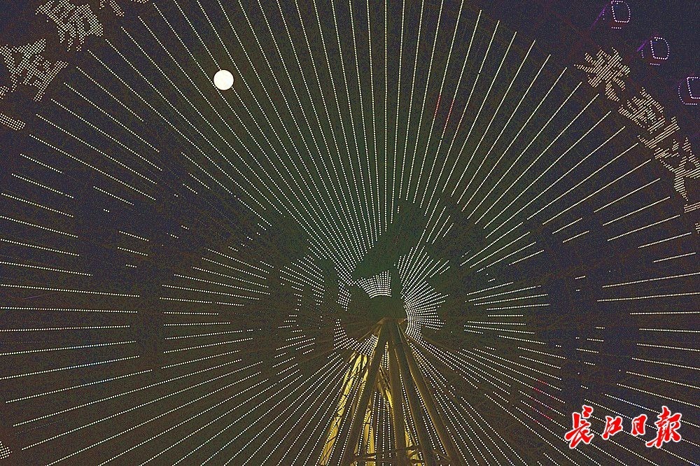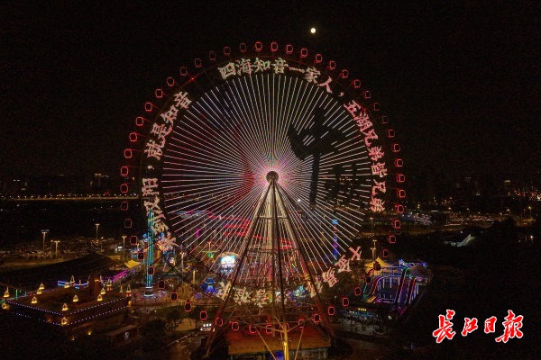 长江日报大武汉客户端10月6日讯 10月6日中秋之夜,武汉市汉阳区恒达欢乐世界上演了一场别开生面的光影盛宴。园区内高大的摩天轮变身巨型画布,轮番呈现中秋月圆主题画面,与夜空中高悬的玉盘遥相呼应,成为节日夜空中引人注目的景观,为武汉市民带来一场视觉盛宴。众多游客驻足观赏,感受“圆魄上寒空,皆言四海同”的美好意境。