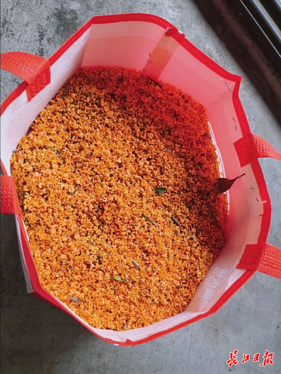 市民陈女士给记者展示自己捡拾的桂花。记者余睿 摄