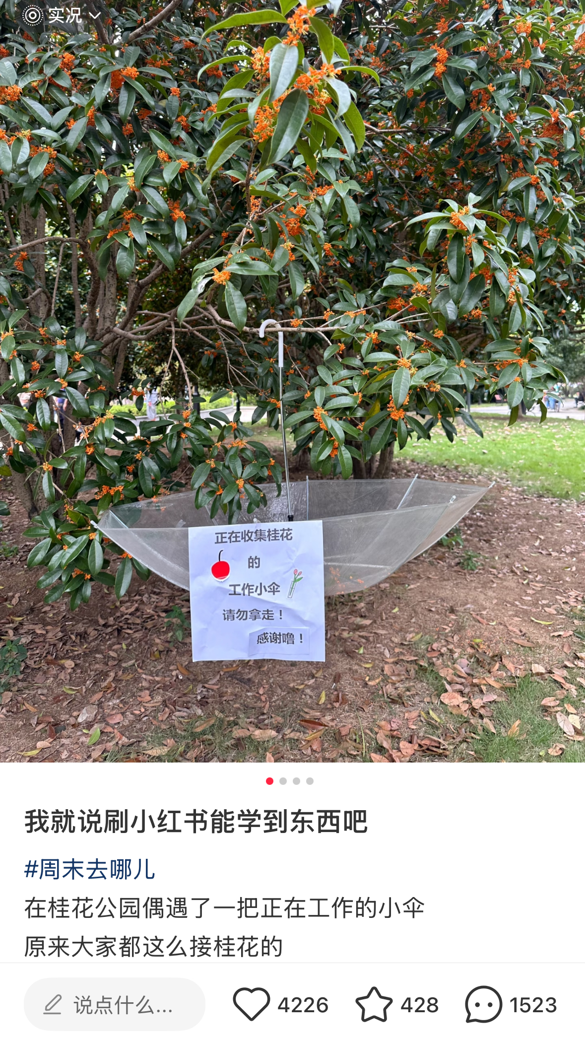 一位市民分享的用透明雨伞悬挂在桂花树上捡花的方法收获了很多点赞。