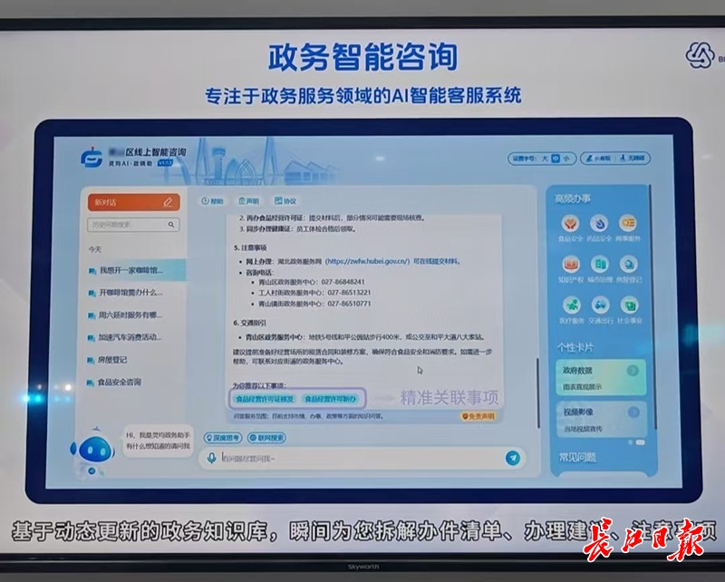 “我想开一家咖啡馆需要办什么证?”在武汉大数据产业发展有限公司(以下简称“武汉大数据公司”)展台前,参观者吴女士正在体验“AI公务员”服务。