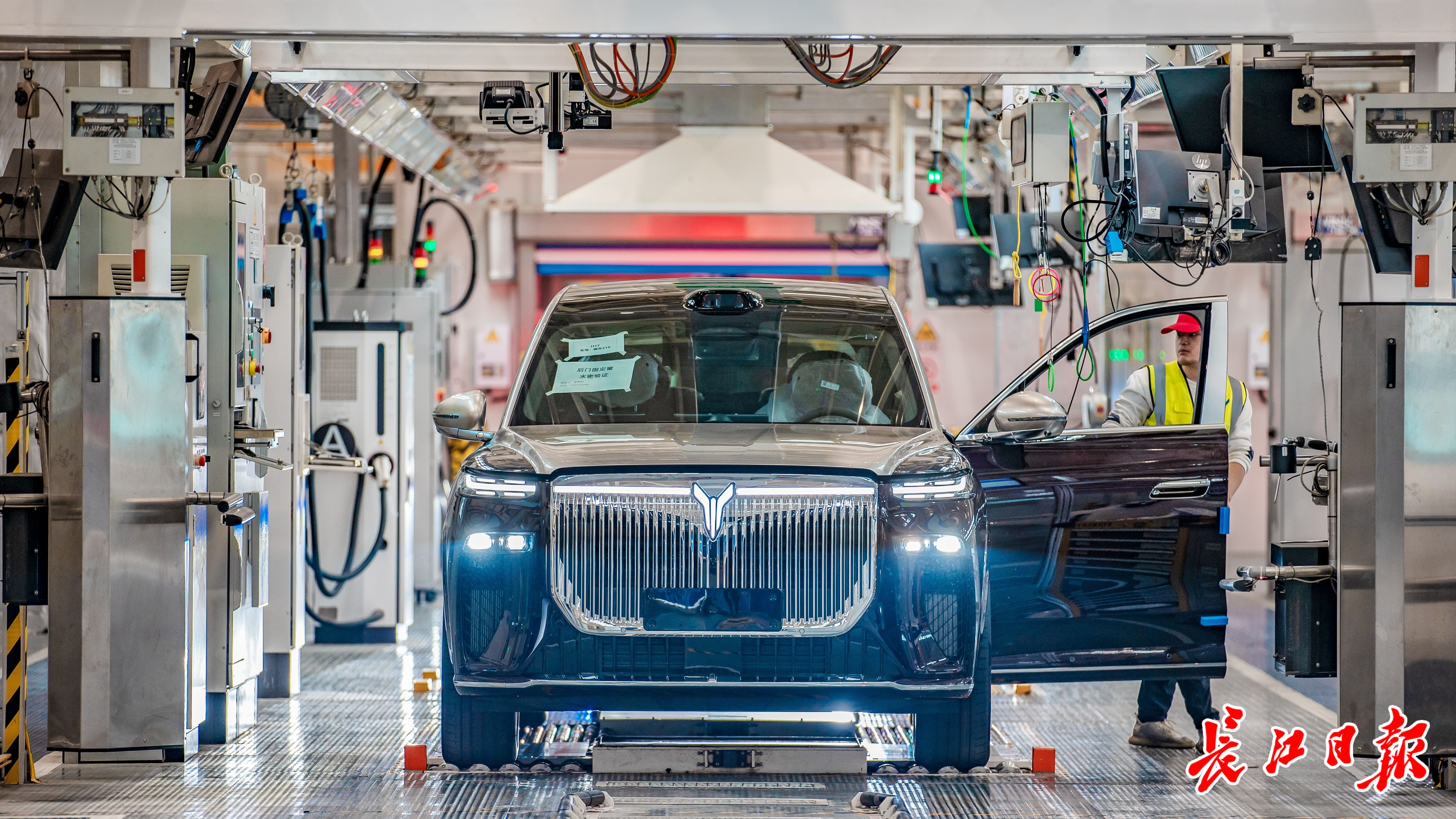 岚图工厂总装车间,工人在对即将下线的岚图泰山进行检验。 记者陈亮 摄