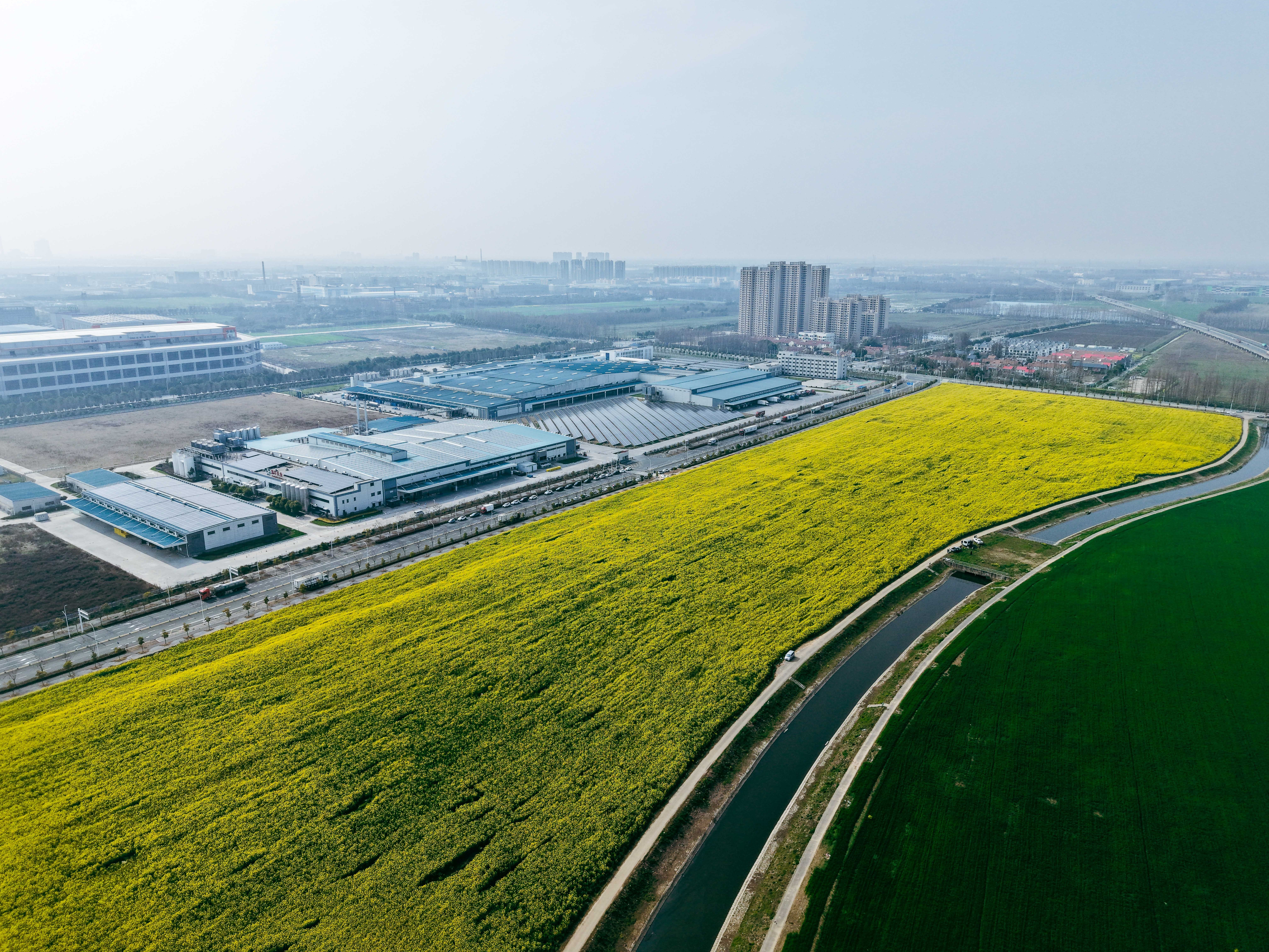 长江日报大武汉客户端3月13日讯 春风拂面,万物复苏。3月11日下午,位于“四线一口”武荆高速新沟镇段蒙牛乳业厂区旁的油菜花田里,一片欢声笑语。放眼望去,金灿灿的油菜花竞相绽放,与田间绿油油的麦苗交织成一幅春日画卷。