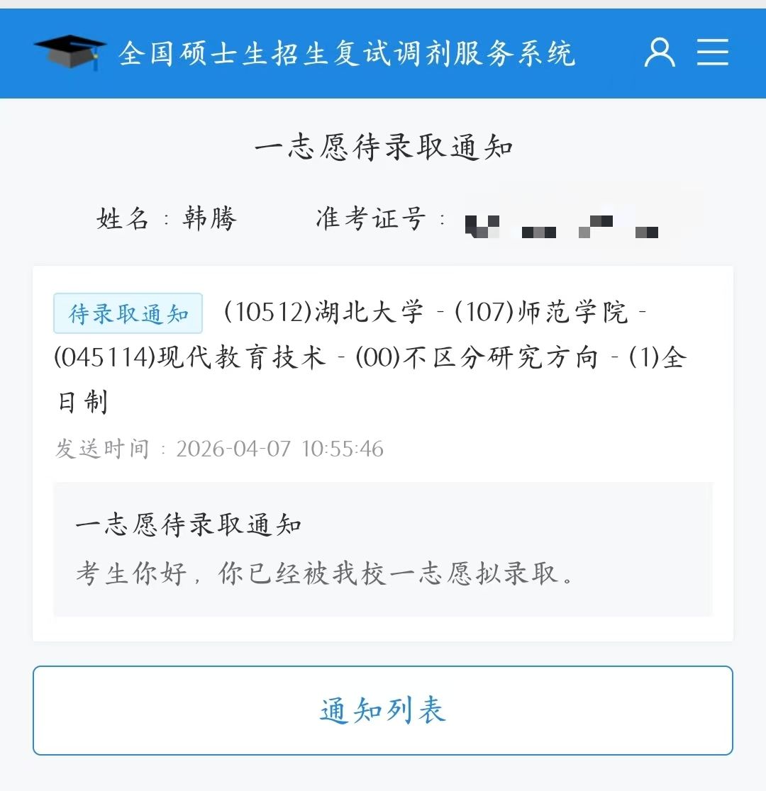 4月7日,韩腾收到了湖北大学硕士生待录取通知,他被该校师范学院现代教育技术专业拟录取。