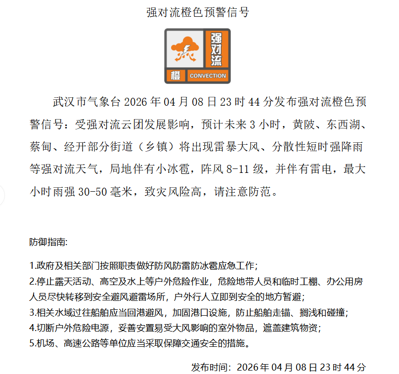 武汉发布强对流橙色预警
