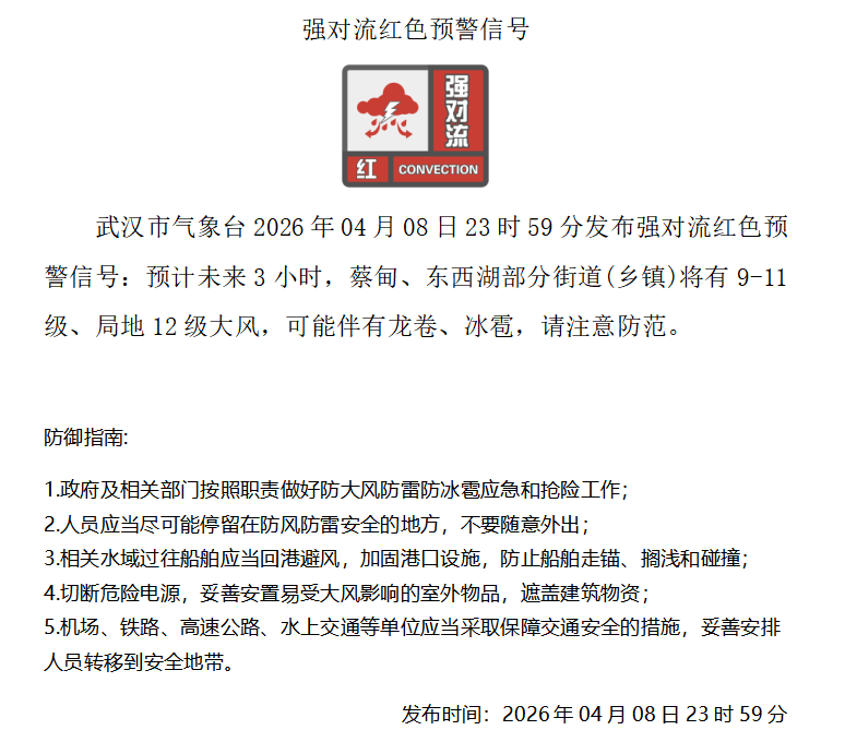 强对流红色预警:武汉局地将有大风,可能伴有龙卷、冰雹